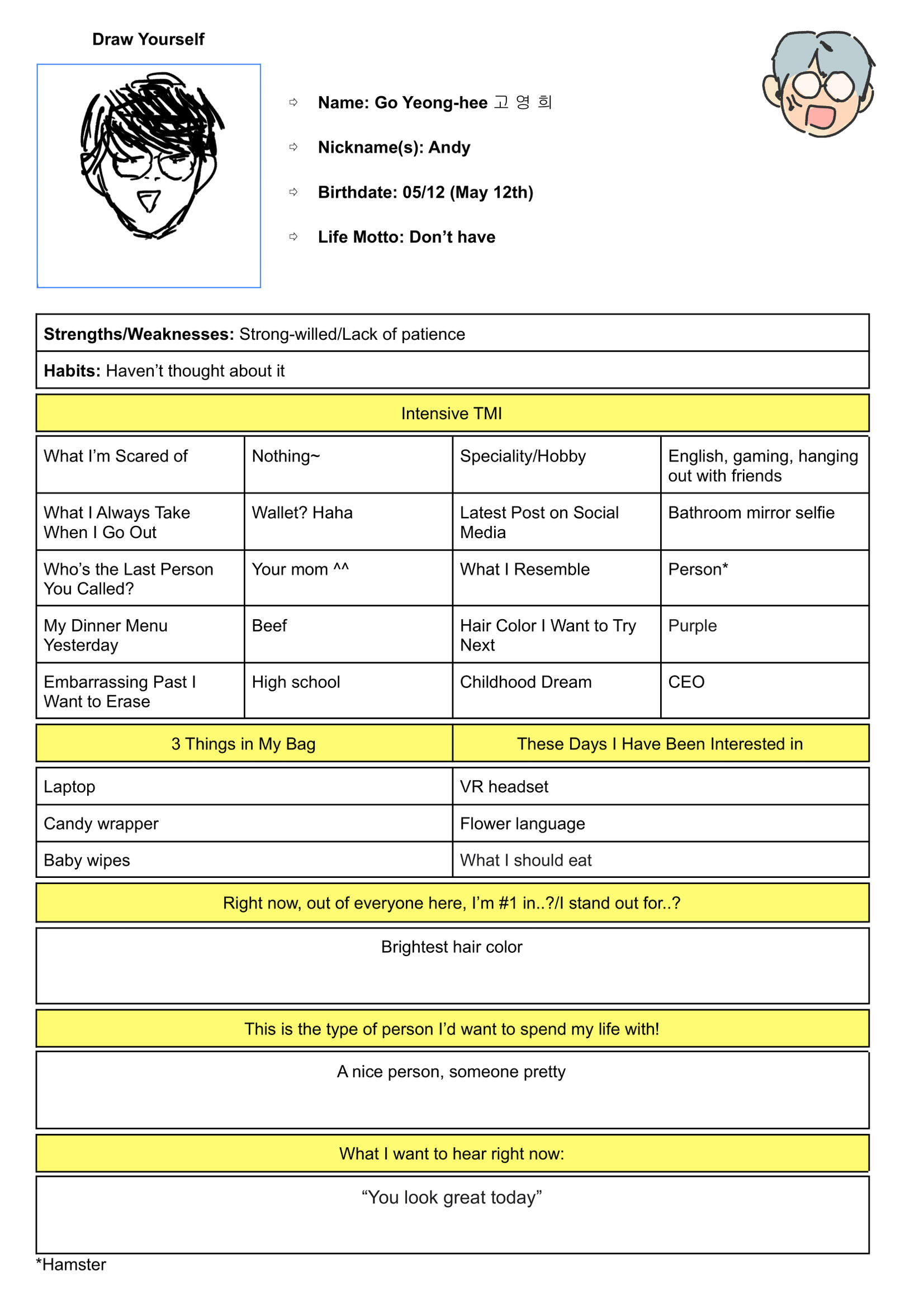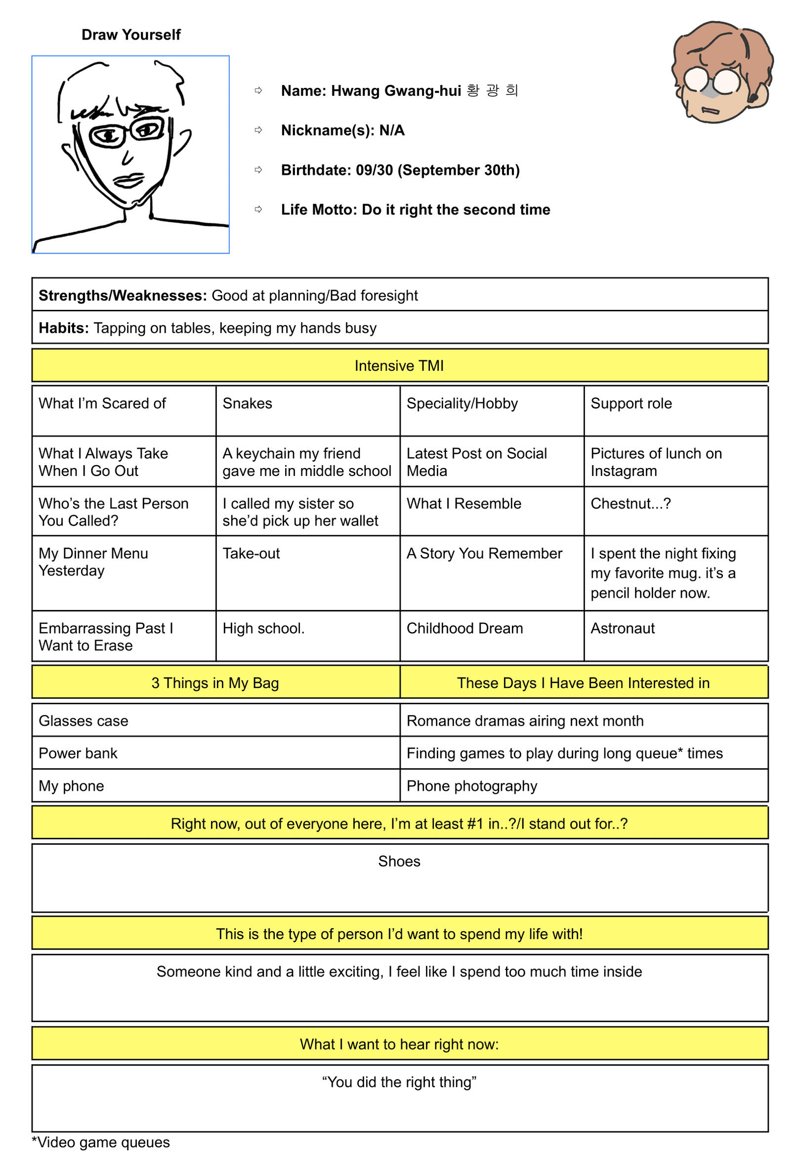 Yeonghee is prideful, he's drawn to competitive hobbies, like high-rank gaming! He hates to lose!Gwanghui's existence seems to bother him, ever since their fight in high-school...He's a part-time florist.Emoji: 🌷