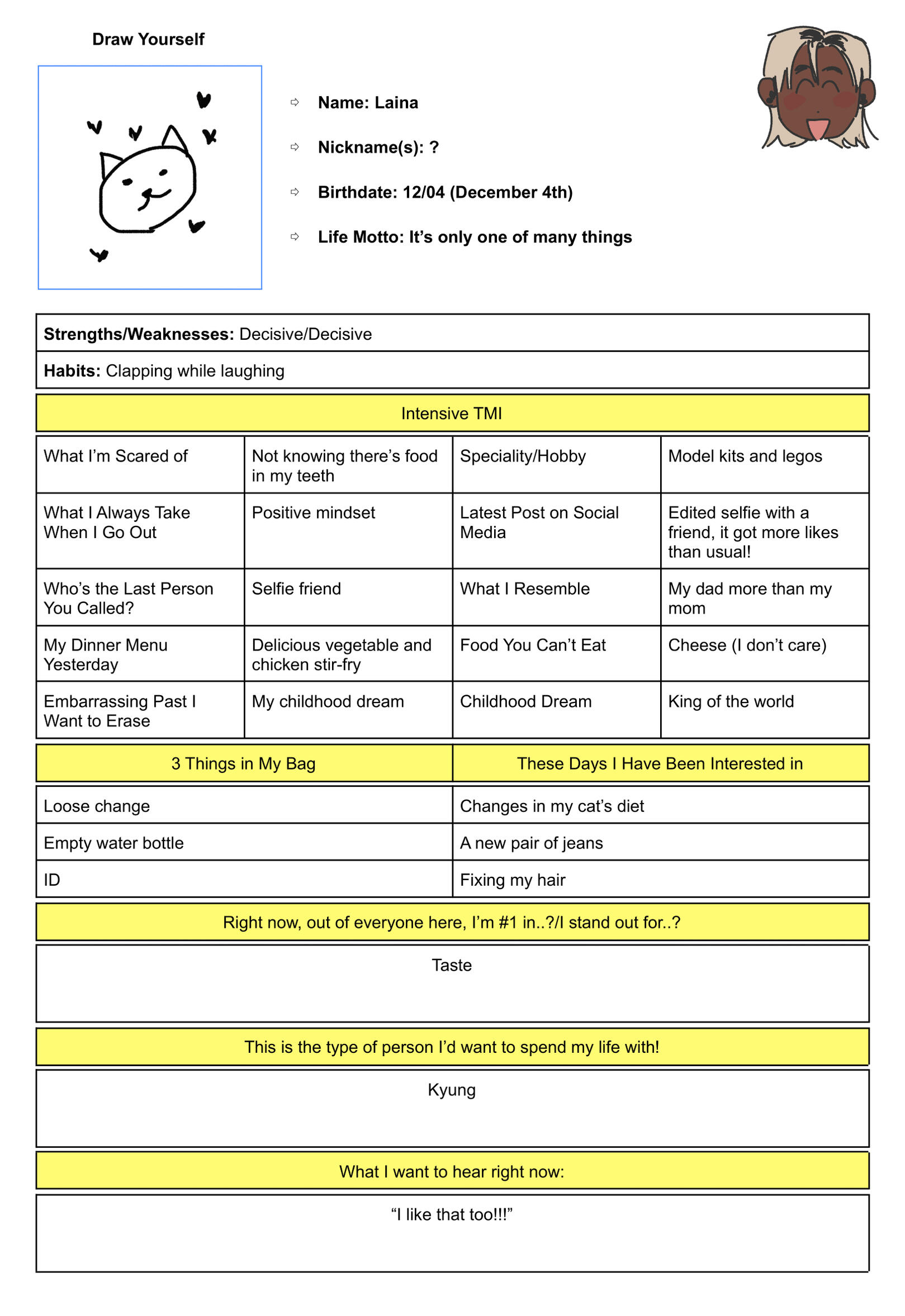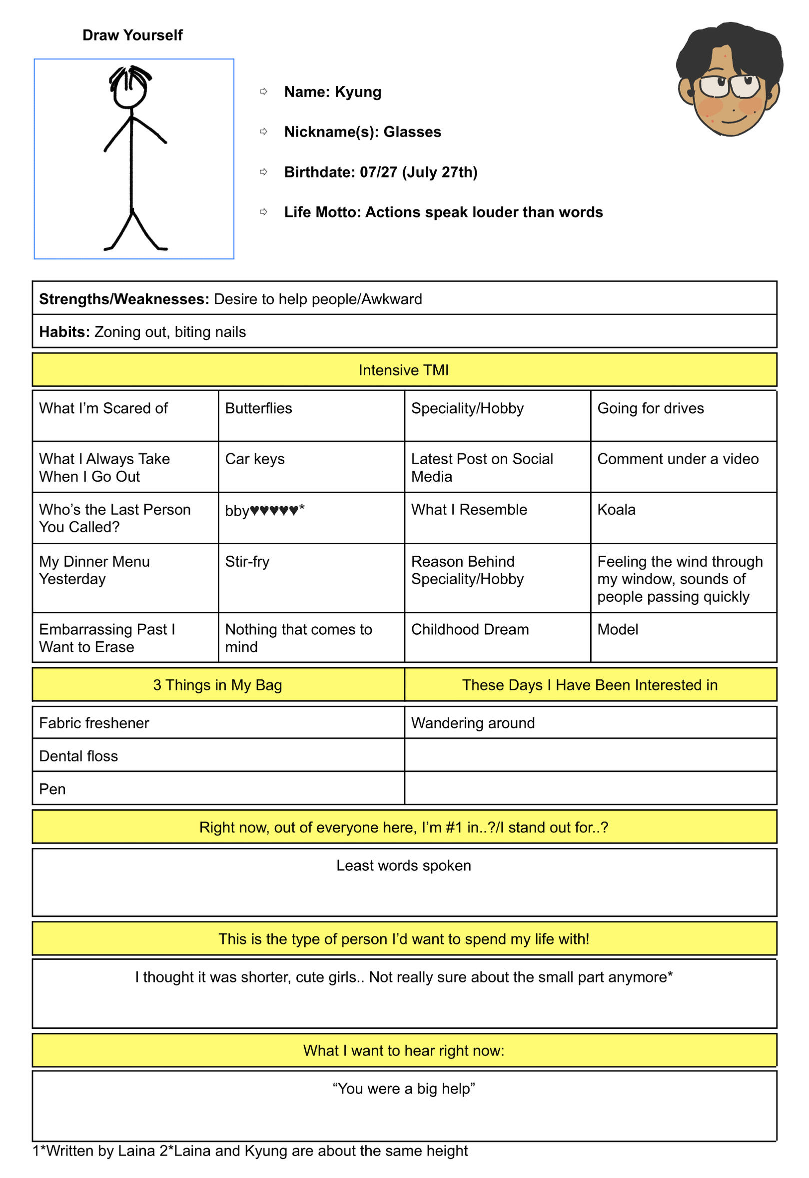 Kyung is a woman of few words. She's popular with peers and underclassmen, generous, and unable to keep up with their invites to get-togethers.She seems to have a romantic view of what she likes. A busy imagination.Emoji: 👓
