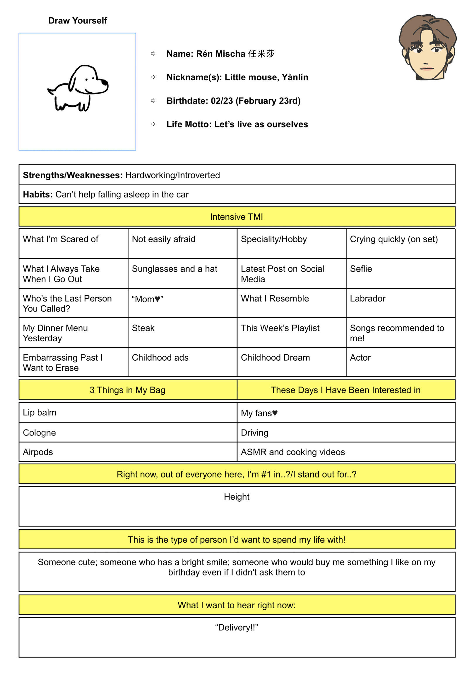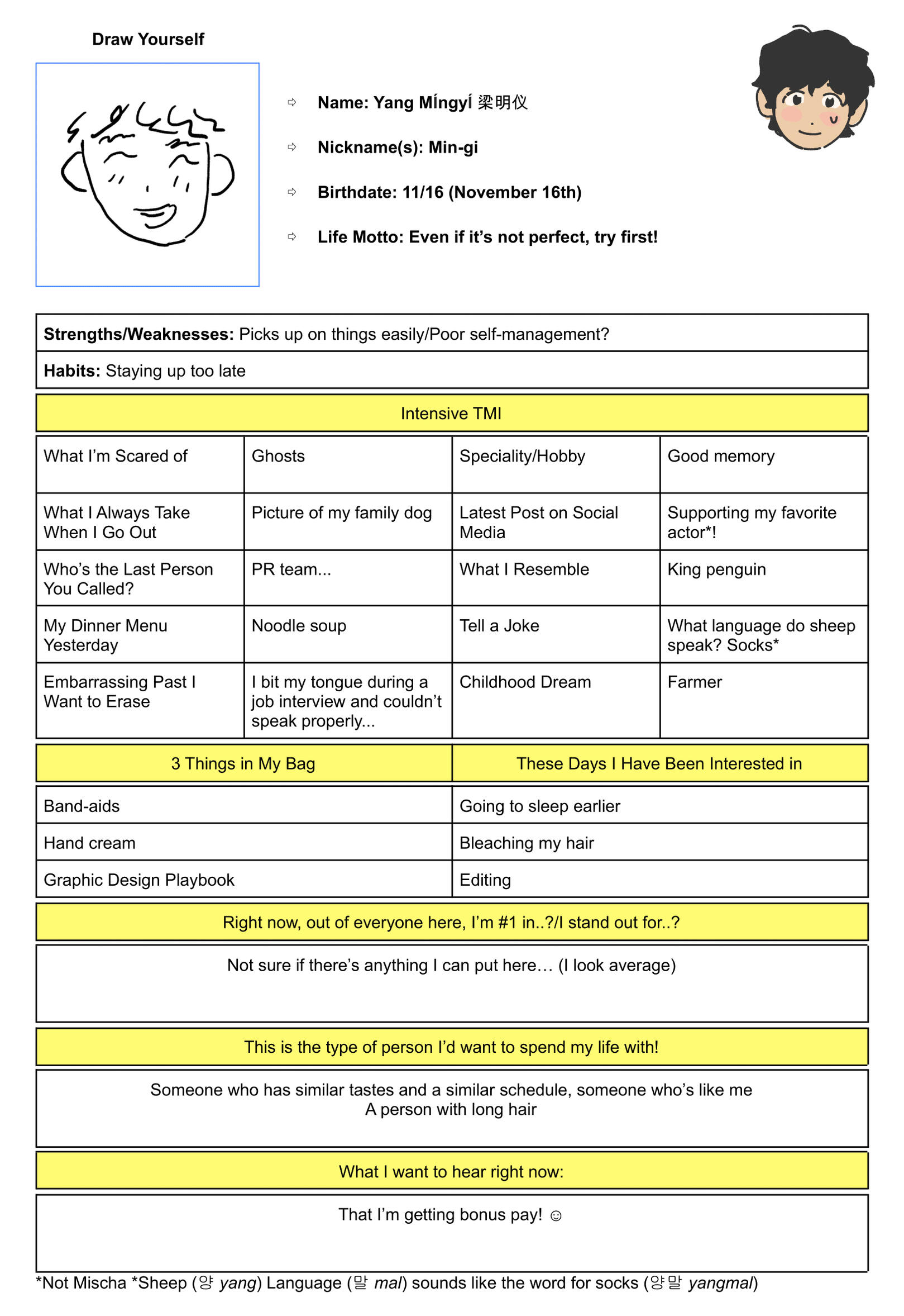 Mingyi, although he is the same age as Mischa, acts as his manager, handling this unpredictable position with a kind attitude.He has a nosy habit toward those he cares about, a category that includes Mischa. How could he end up fired?Emoji: 🐧